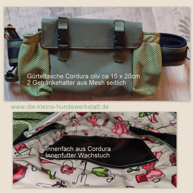 handgenähter Rucksack aus leichtem Cordura, ca 32 x 30cm, robust, wasserbeständig, innen Nylonfutter und Einschubtasche aus Cordura, außen Flaschennetz aus Mesh, gepolsterte Träger, die geöffnet werden können, Klettband zum Befestigen des Gürtels; Führgürtel 5cm breit, oliv-braun, Meshpolster, kleinste Einstellung 100cm, verstellbar bis ca 150cm, mehrere Ringe zum Einhängen von Leinen, Taschen, etc, unterpolsterte Steckschnalle, Sicherungsschlaufe in die auch eine Leine eingehängt werden kann, Leckerlibeutel, der über den Gürtel geschoben werden kann - Einzelstück