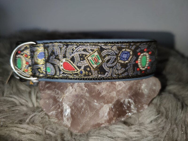 Borte ca 29mm breit, auf schwarzem Gurtband 30mm, Steckschließe 30mm, gefüttert mit weichem Leder in taubenblau, Gesamtbreite ca 33mm für Halsumfang 36 - 44cm - dieses Halsband gibt es auch in anderen Größen