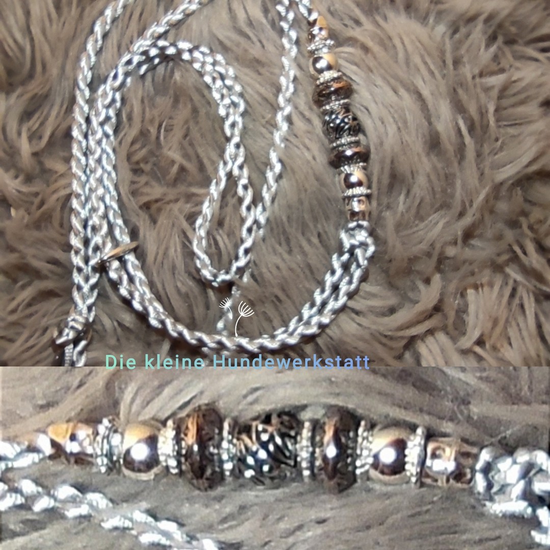 handgeflochtene Showleine in allen Satinfarben möglich - mit Perlenzusammenstellung extra für Ihren Hund - Halsschlaufe mit Perle zum Verschieben, Abschlußknoten, Länge ca 100- 110cm inkl. Halsschlaufe