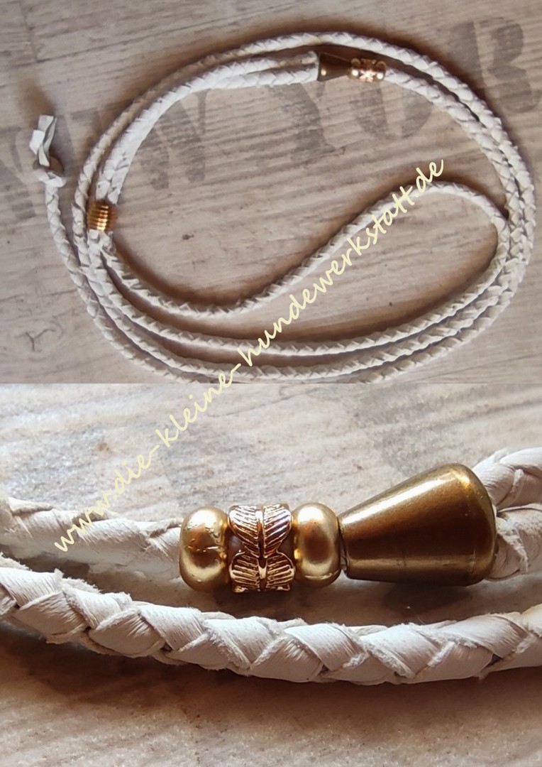 schlichte, edle Leine, handgeflochten auf Kern, Halsschlaufe durch Goldperle verstellbar, Abschlußknoten, Länge ca 110cm