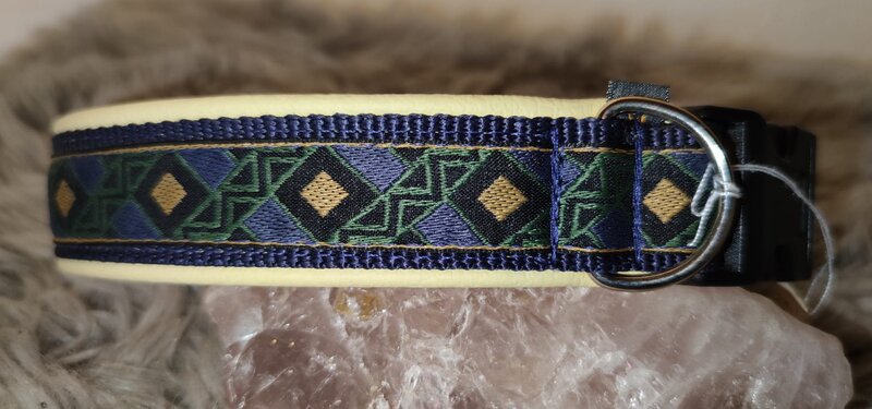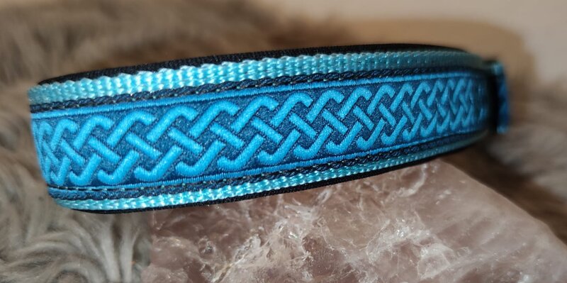 Borte ca 29mm breit, auf schwarzem Gurtband 30mm, Steckschließe 30mm, gefüttert mit weichem Leder in taubenblau, Gesamtbreite ca 33mm für Halsumfang 36 - 44cm - dieses Halsband gibt es auch in anderen Größen