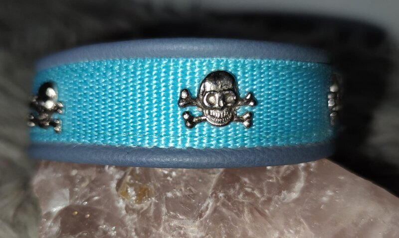 gefüttert mit taubenblauem Nappa, Klickverschluss, Gurtbandbreite 25mm, verziert mit Nieten Totenköpfchen, Rollschnalle für Halsumfang ca 29-35cm