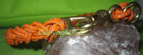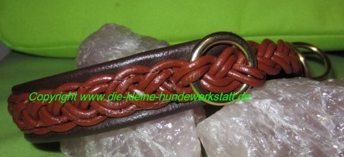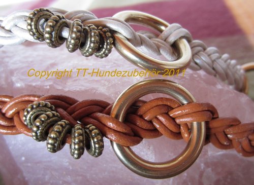 Die geflochtenen Halsbänder mit festem Verschluss wie Brummelhaken oder Zügelsnap haben einen zusätzlichen kleinen Ring zum Anleinen.Der Grund ist, dass ein Snap oder Flaggleinenwirbel eine bestimmte Sollbruchlast hat oder auch brechen kann, wenn er verkantet wird. Daher empfiehlt es sich nicht, an den Haken direkt anzuleinen!