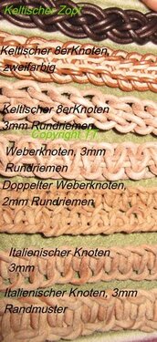 Unten in der Galerie finden Sie verschiedene Knoten, den keltischen 8er Knoten, einen keltischen Zopf mit Querstrang,