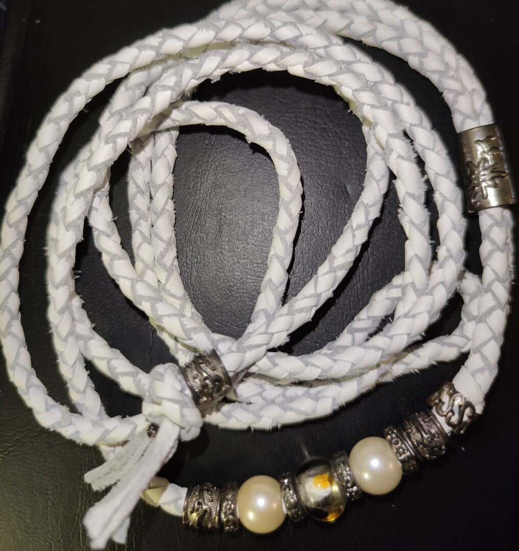 handgeschnitten, handgeflochten auf Kern, Gesamtlänge inkl. Halsschlaufe ca 140cm, Altsilberperlen, Pandoraperle sowie perlmuttfarbene Perlen